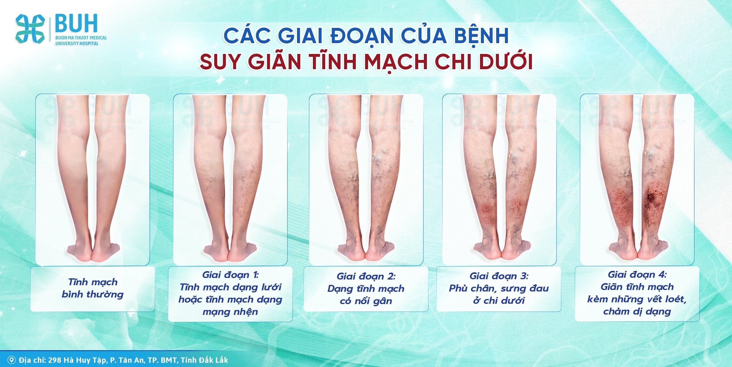 Bệnh viện Đại học Y Dược Buôn Ma Thuột tiếp nhận thăm khám và điều trị bệnh lý suy giãn tĩnh mạch chi dưới ở các giai đoạn. Quá trình thăm khám và điều trị được thực hiện bởi TS.BS. Hoàng Văn Thiệp với hơn 40 năm kinh nghiệm trong chẩn đoán và điều trị các bệnh mạch máu nói chung và bệnh suy tĩnh mạch chi dưới nói riêng. Rất nhiều bệnh nhân đã được phát hiện và can thiệp hiệu quả, triệt để, quay lại sinh hoạt cuộc sống bình thường.
